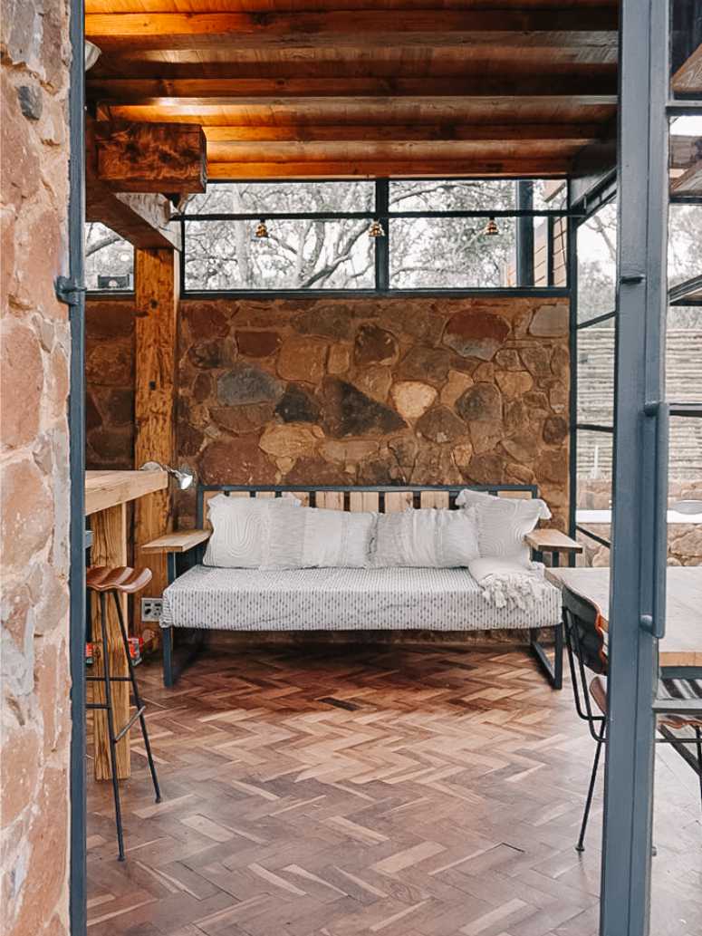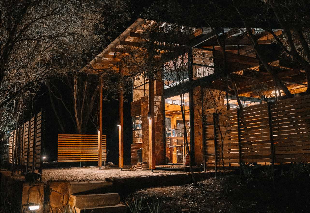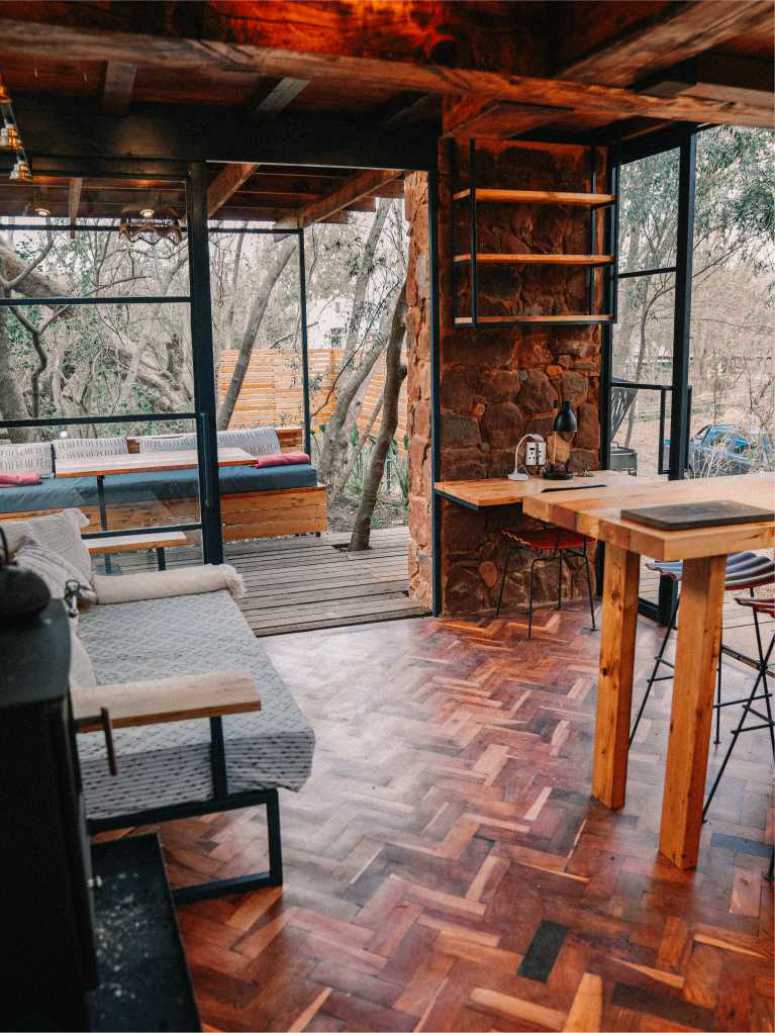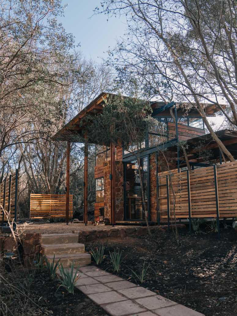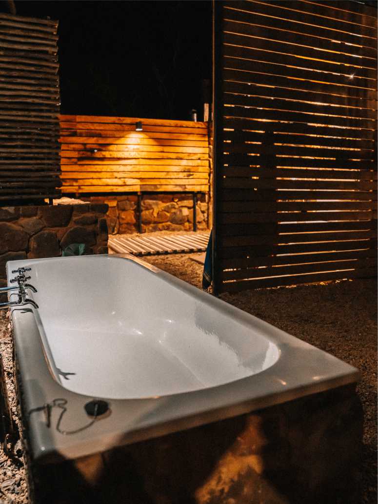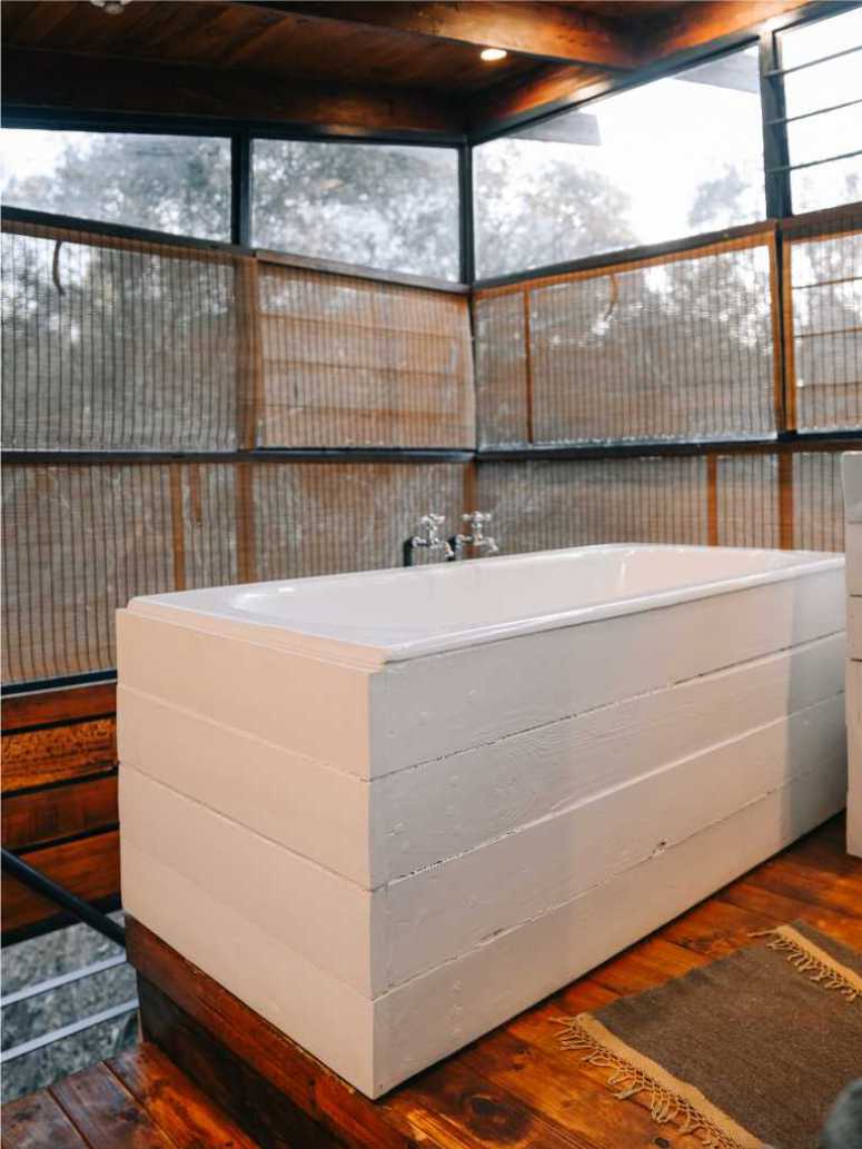 The Mana Cabin is a self catering unit for 2. A cosy, rock & wood cabin with big windows looking out into the trees on all sides. The tiny-home was designed with the smallest footprint possible, maximising the outside spaces which features a bath, daybed, fireplace, bathroom and lounge deck.