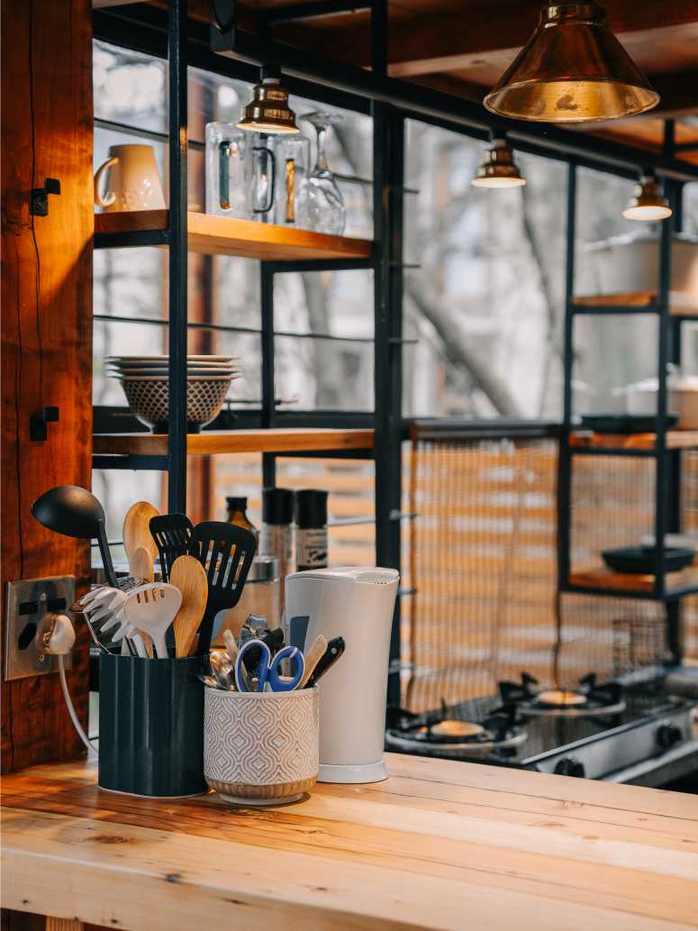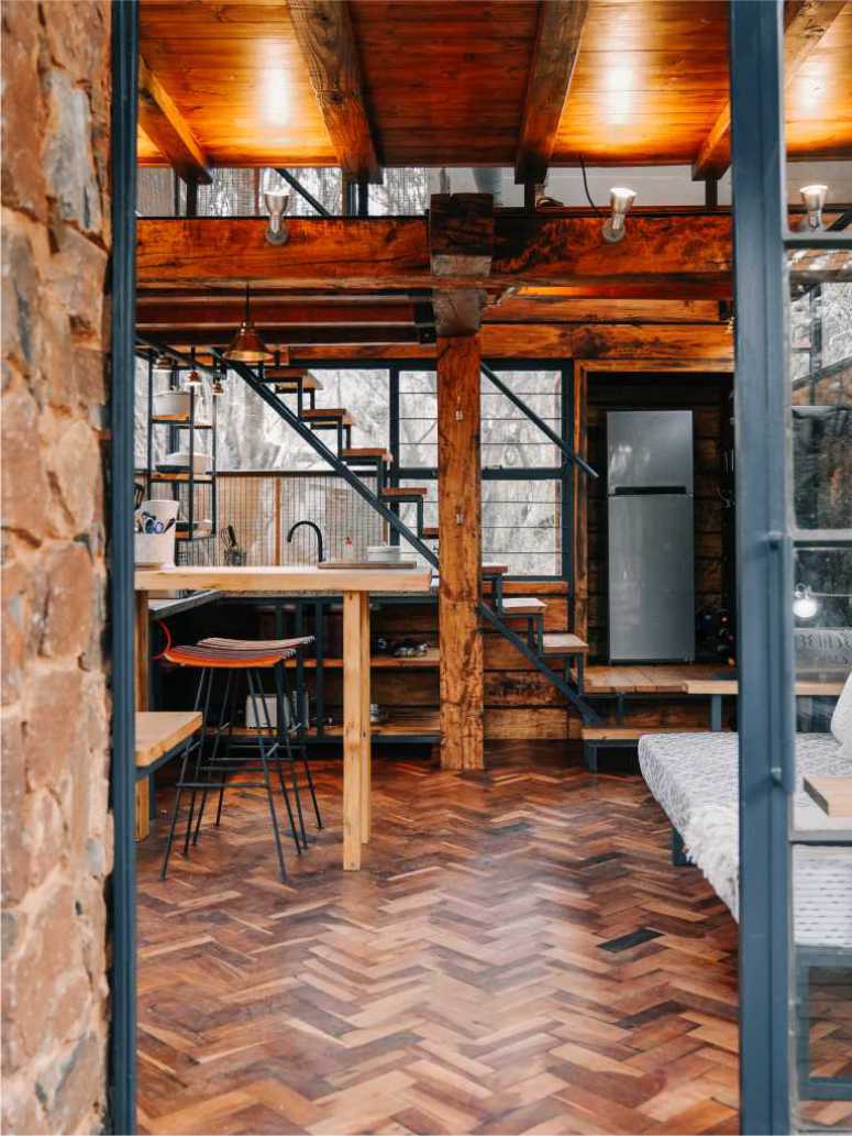 Our prefabricated cabin uses reclaimed materials like the parquade flooring, oregon & poplar timber, industrial window frames and steel details. With two big sliding-doors downstairs, and 1 infront of the bed upstairs, the cabin has the outdoor-indoor adjustability of modern luxury houses in a cozy, comfortable size for 2 people.